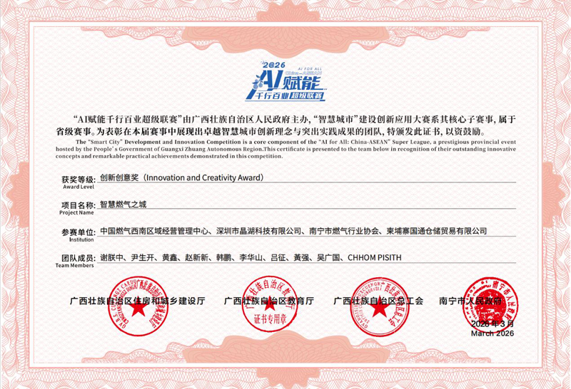 近日,由广西壮族自治区住房和城乡建设厅、广西壮族自治区教育厅、广西壮族自治区总工会、南宁市人民政府联合主办的2026“AI 赋能千行百业超级联赛(A 超)”之“智慧城市”建设创新应用大赛圆满落幕。中国燃气西南区域经营管理中心牵头,联合深圳市晶湖科技有限公司、南宁市燃气行业协会、柬埔寨国通仓储贸易有限公司共同打造的“智慧燃气之城”项目,凭借前沿的AI技术应用、创新的智慧城市建设理念与扎实的实践成果,从众多参赛项目中脱颖而出,成功斩获省级赛事创新创意奖!